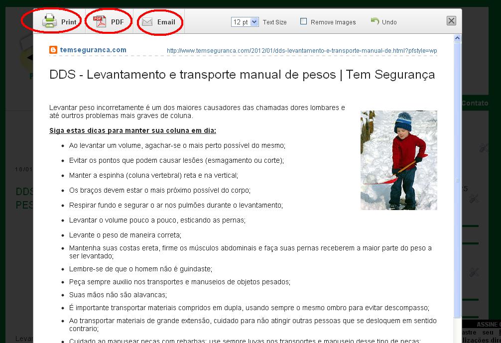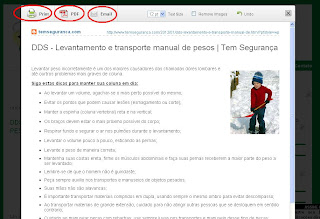Hoje recebi um comentário na postagem DDS – Trabalho em Altura – Andaimes, que me fez pensar na sugestão da colega e leitora do Blog, Juceli Ramasini. Ela comentou que gosta bastante das postagens que recebe em seu email, mas gostaria de salvar em seu computador para quando precisasse. Pois então, cara Juceli, já disponibilizei a possibilidade para não só salvar a postagem, mas também tem a possibilidade de imprimir o texto ou enviar por email. Para imprimir ou salvar é só rolar até o final da postagem e localizar o botão abaixo: